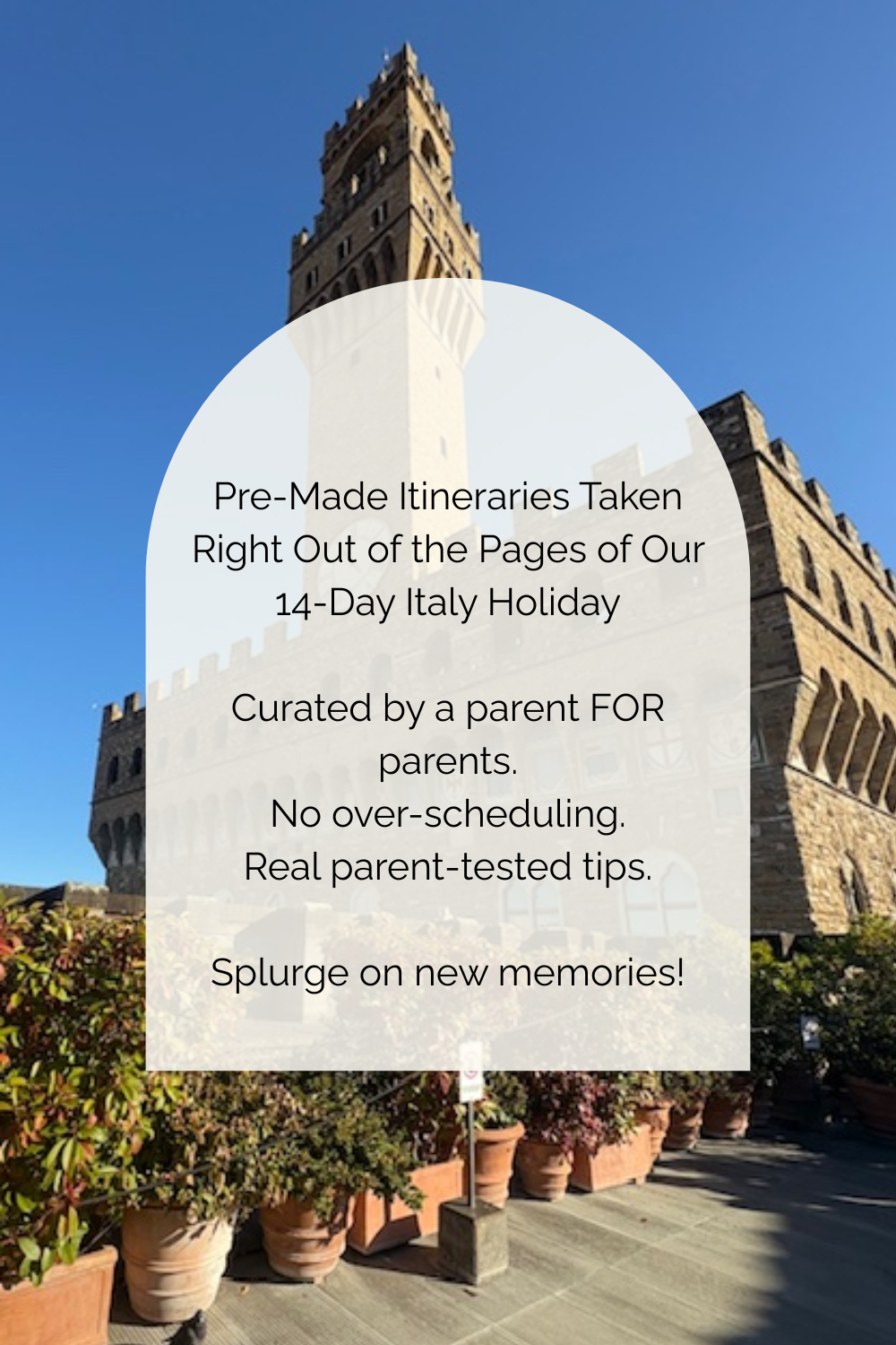 Exploring Florence with kids doesn't have to feel intimidating! This printable itinerary - the third in a 14-day series - can be purchased separate or bundled with other itineraries in this series, and is designed for a stress-free, memorable day in Florence. It includes kid-tested attractions, snack stops, iconic sights, and practical tips for family logistics - because we've been there, done that (for two weeks!).